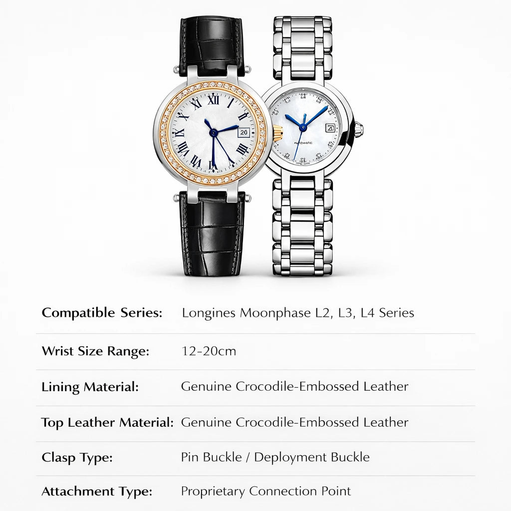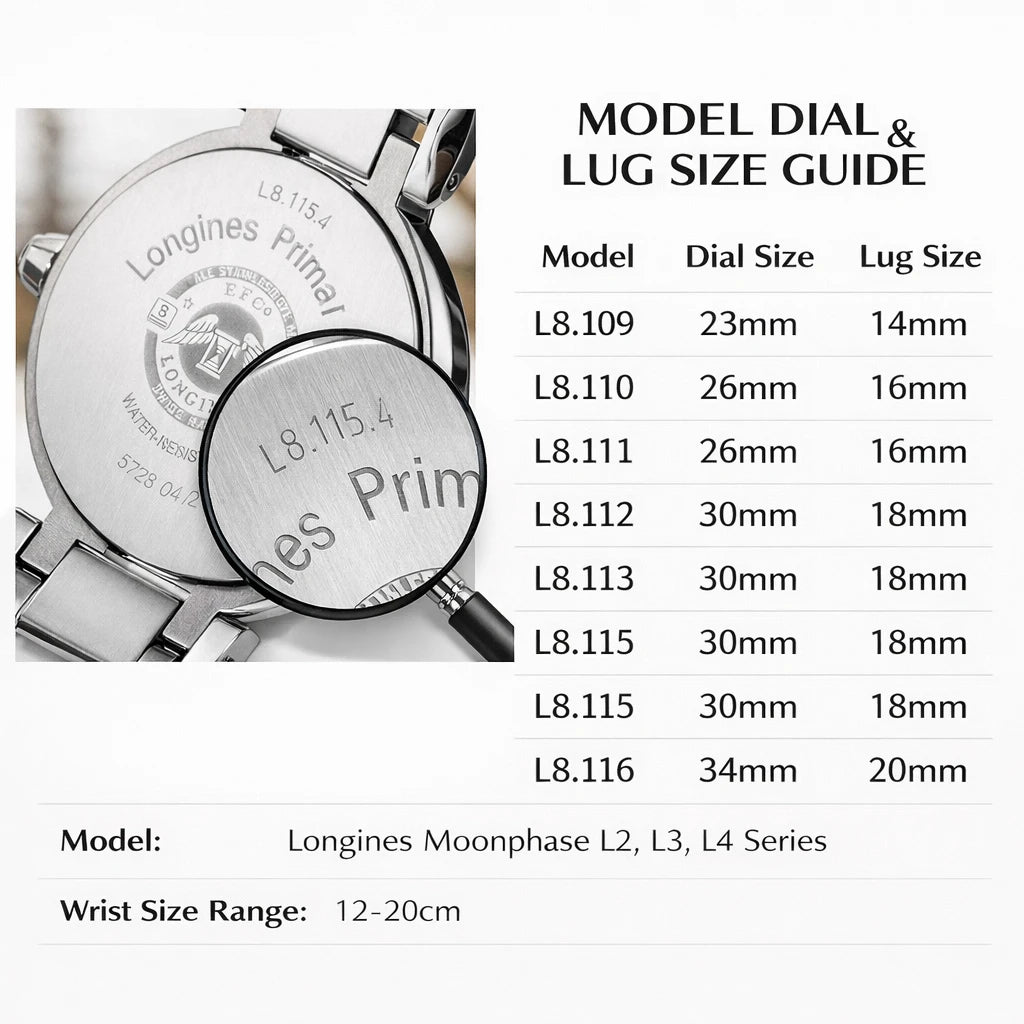 Compatible with Longines PrimaLuna women’s L8.11 series.