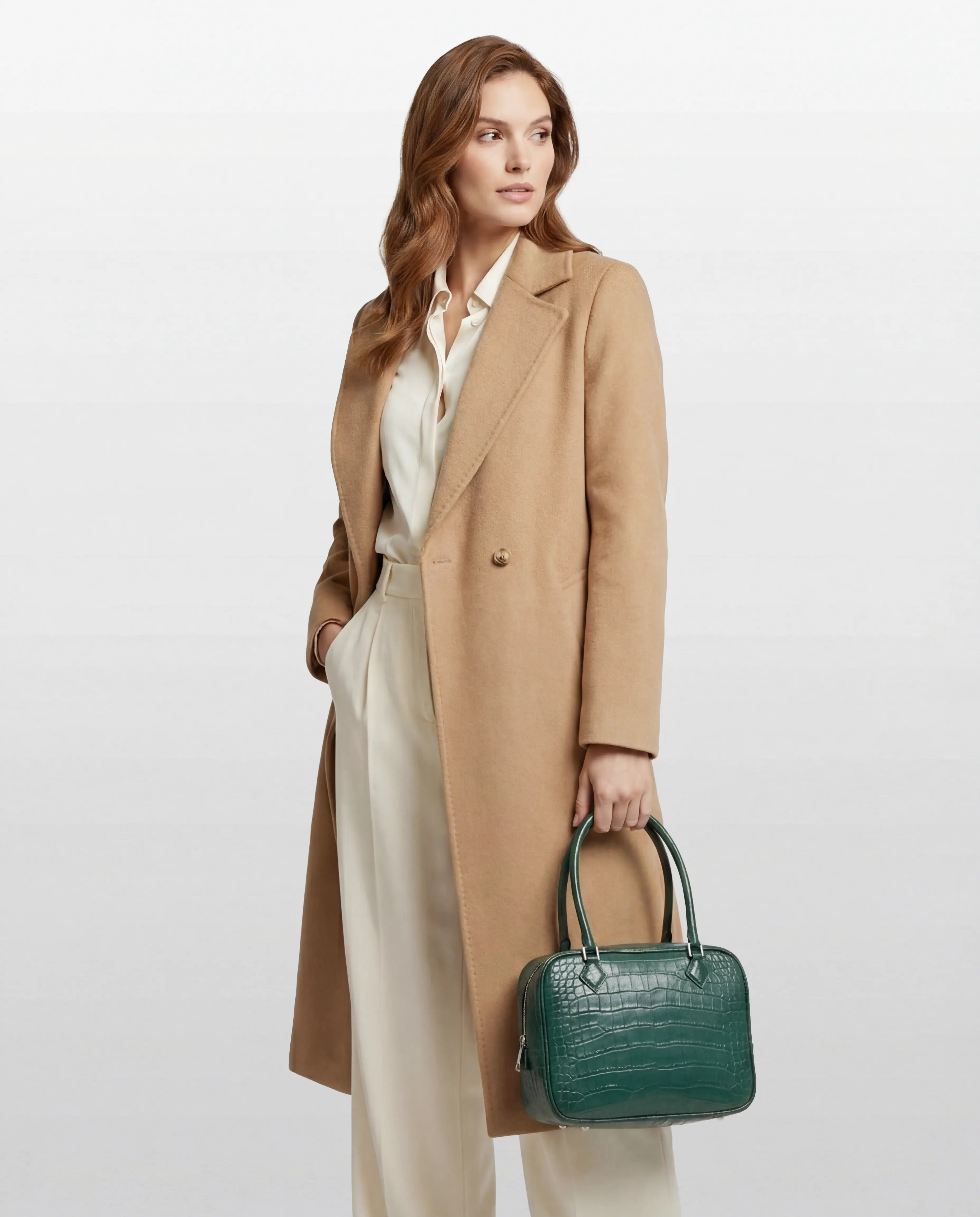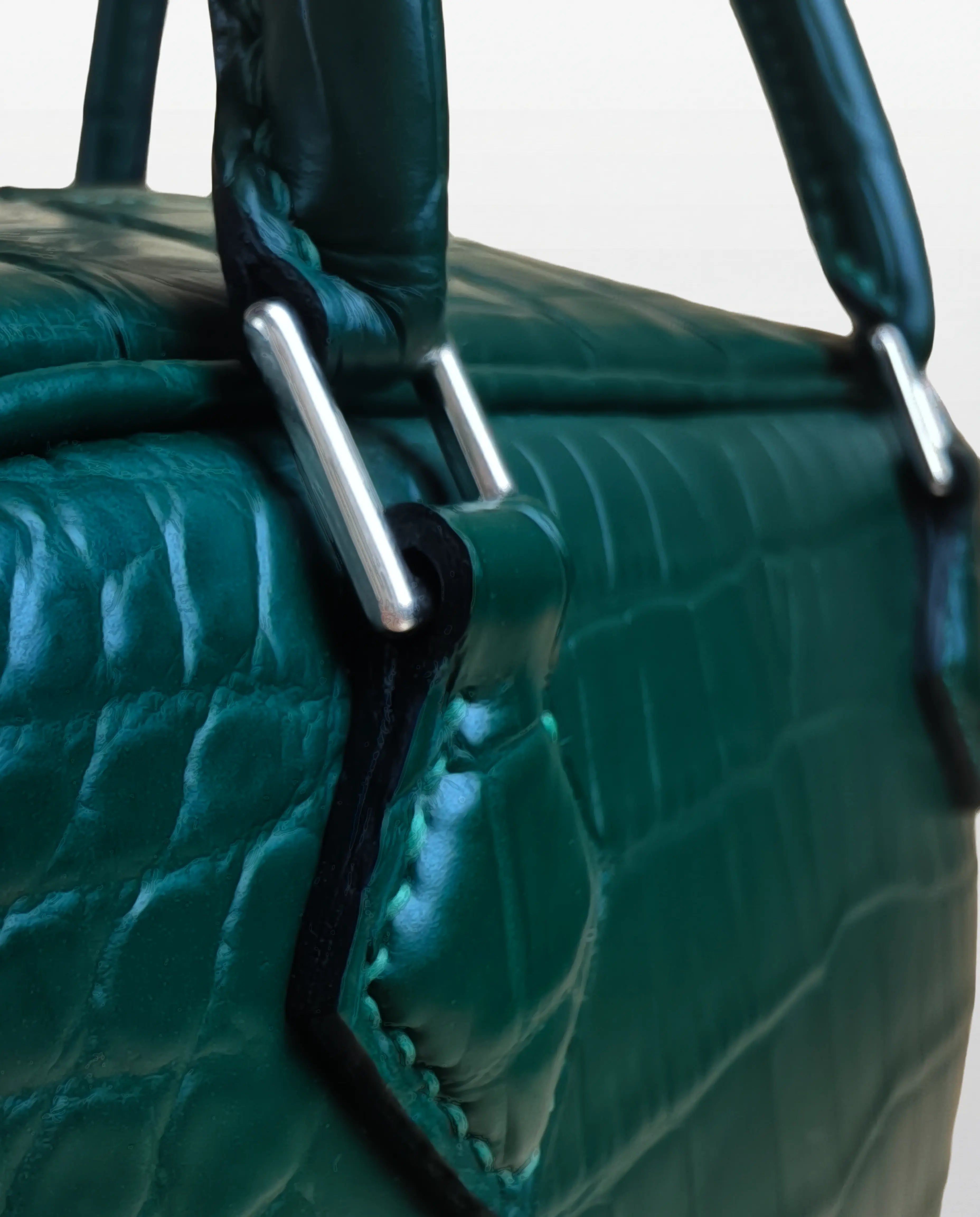 A statement silhouette, defined by depth and authority. This 20cm Handle Bag is hand-stitched by a single artisan from the finest exotic skin, finished in a deep, matte Emerald Green.