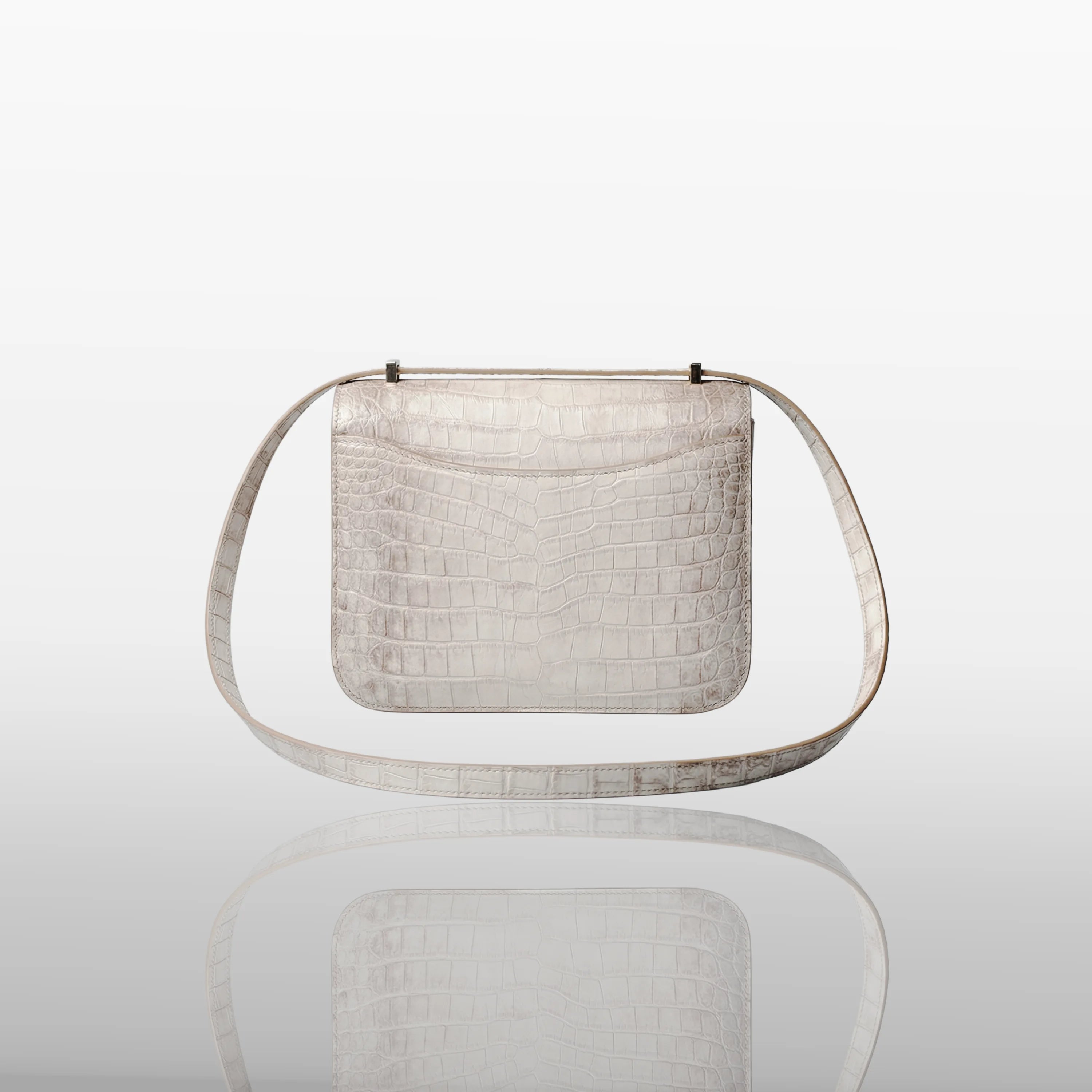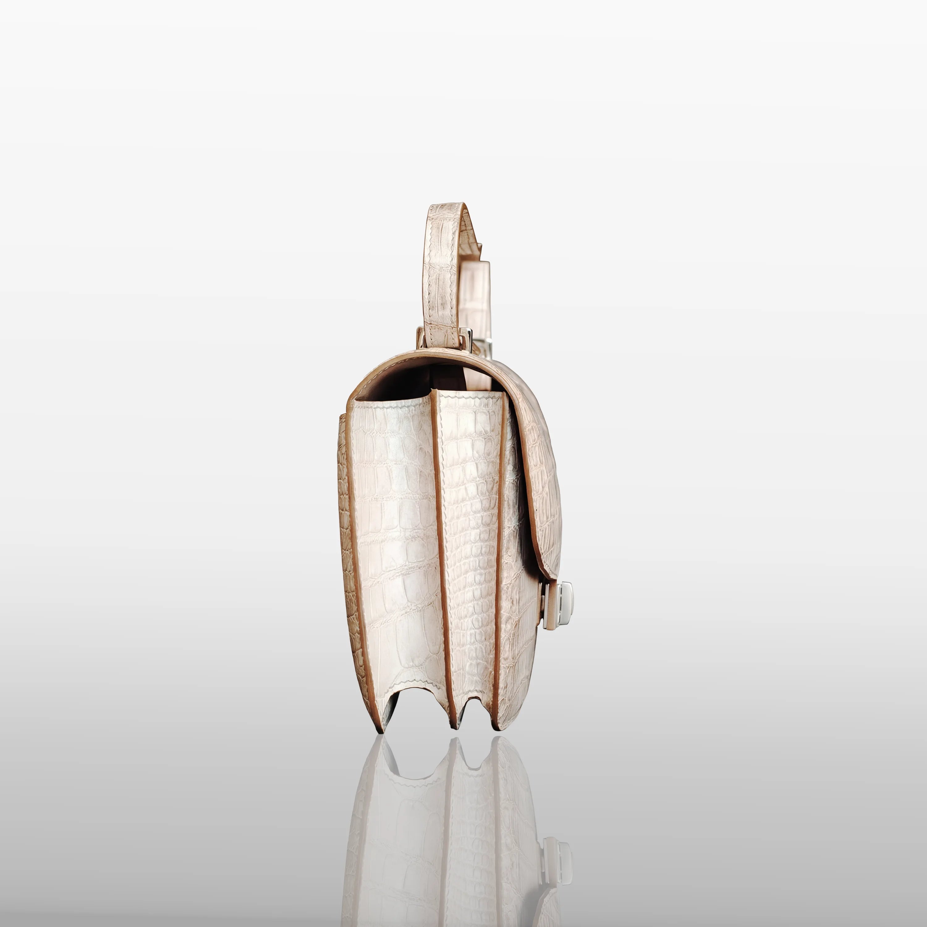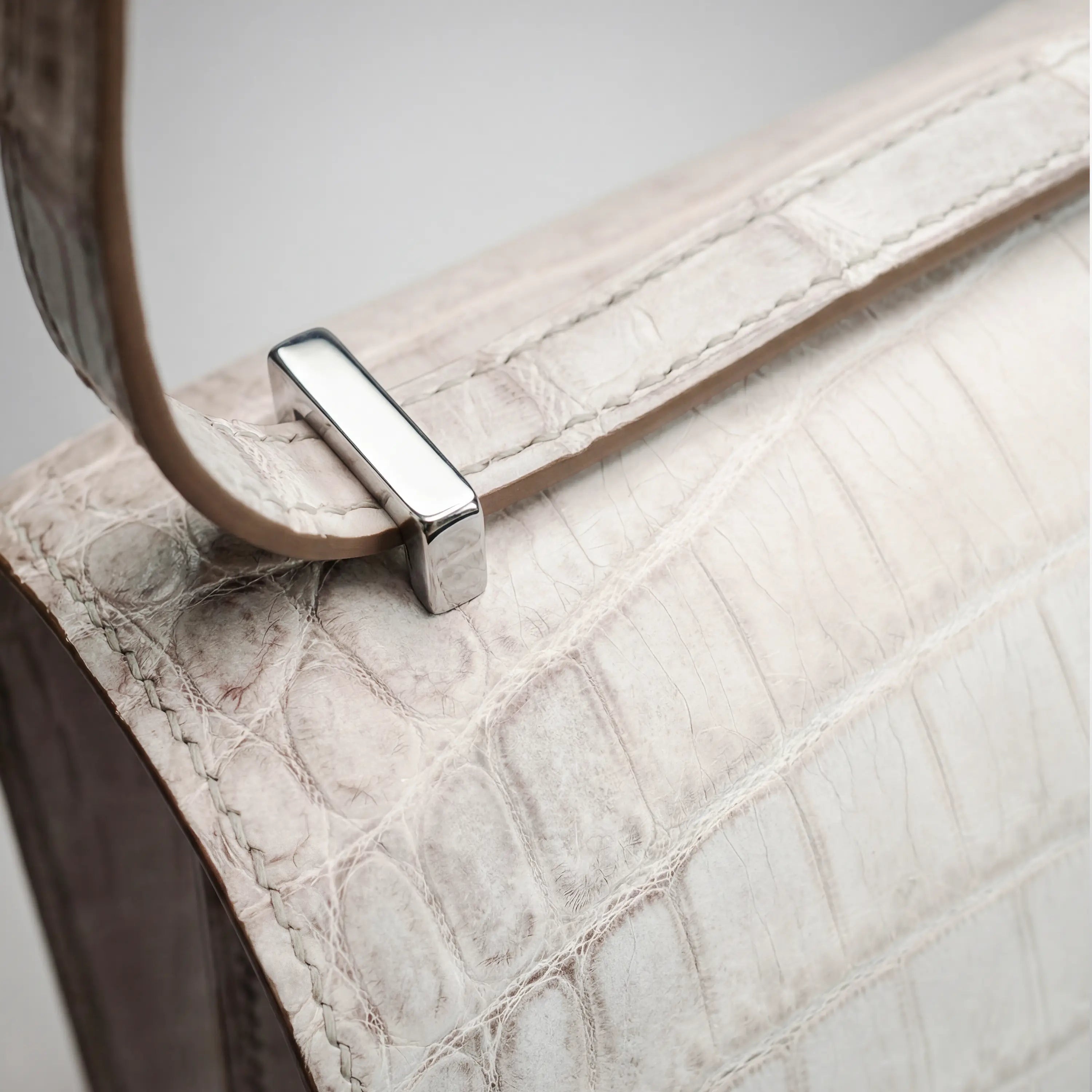 It begins with the source. We exclusively use 100% CITES-Certified Siamese Crocodile. Unlike the broad scales of common species, Siamese leather is prized for its rare, compact "bamboo" grain. This delicate texture allows us to craft petite, architectural silhouettes that are visually harmonious—achieving a level of elegance that mass-produced skins simply cannot replicate.